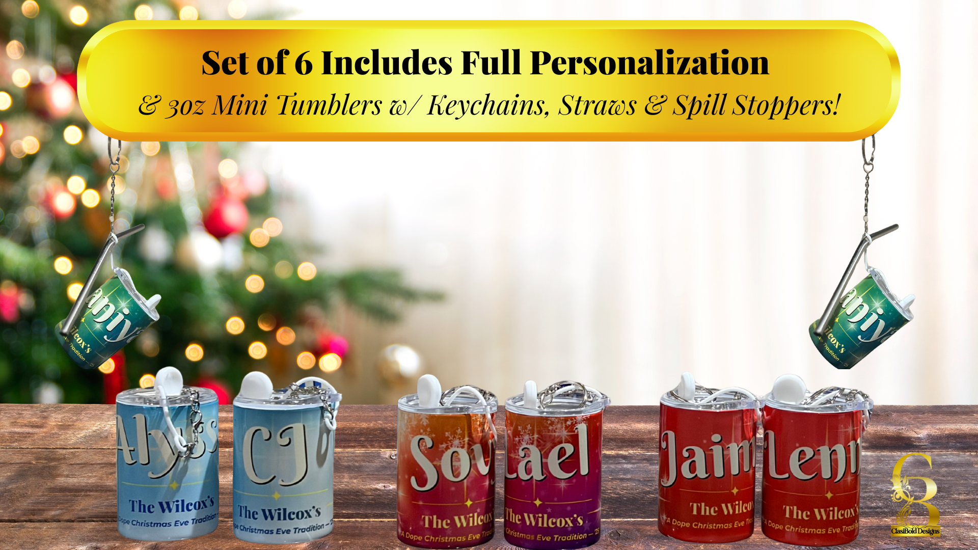 Customizable set of six mini tumbler shot glasses — perfect for gifts, parties, stocking stuffers & ornaments.